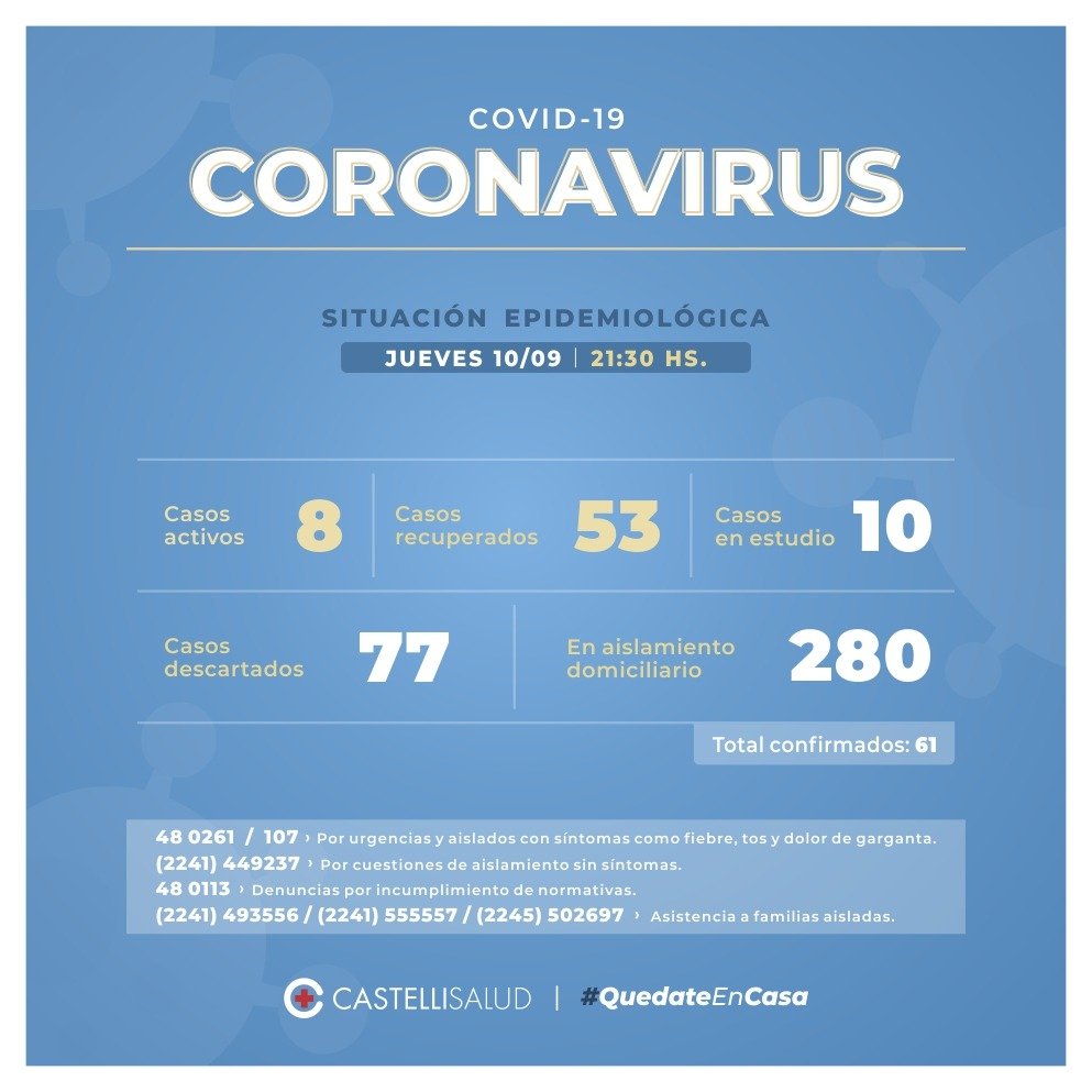 ✅ El total es de 8 casos positivos activos, 53 casos recuperados, 10 casos en estudio, 77 casos descartados y un total de 280 personas aisladas de forma preventiva.