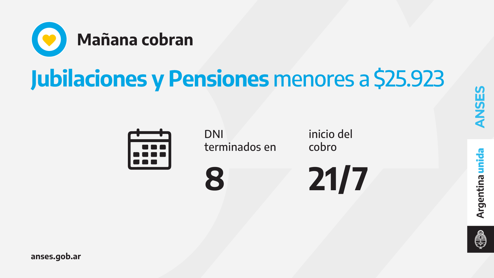 Las sucursales bancarias habilitadas atenderán por ventanilla a jubilados, jubiladas, pensionados y pensionadas con documentos terminados en 8 cuyos haberes NO SUPEREN la suma de 25.923 pesos.