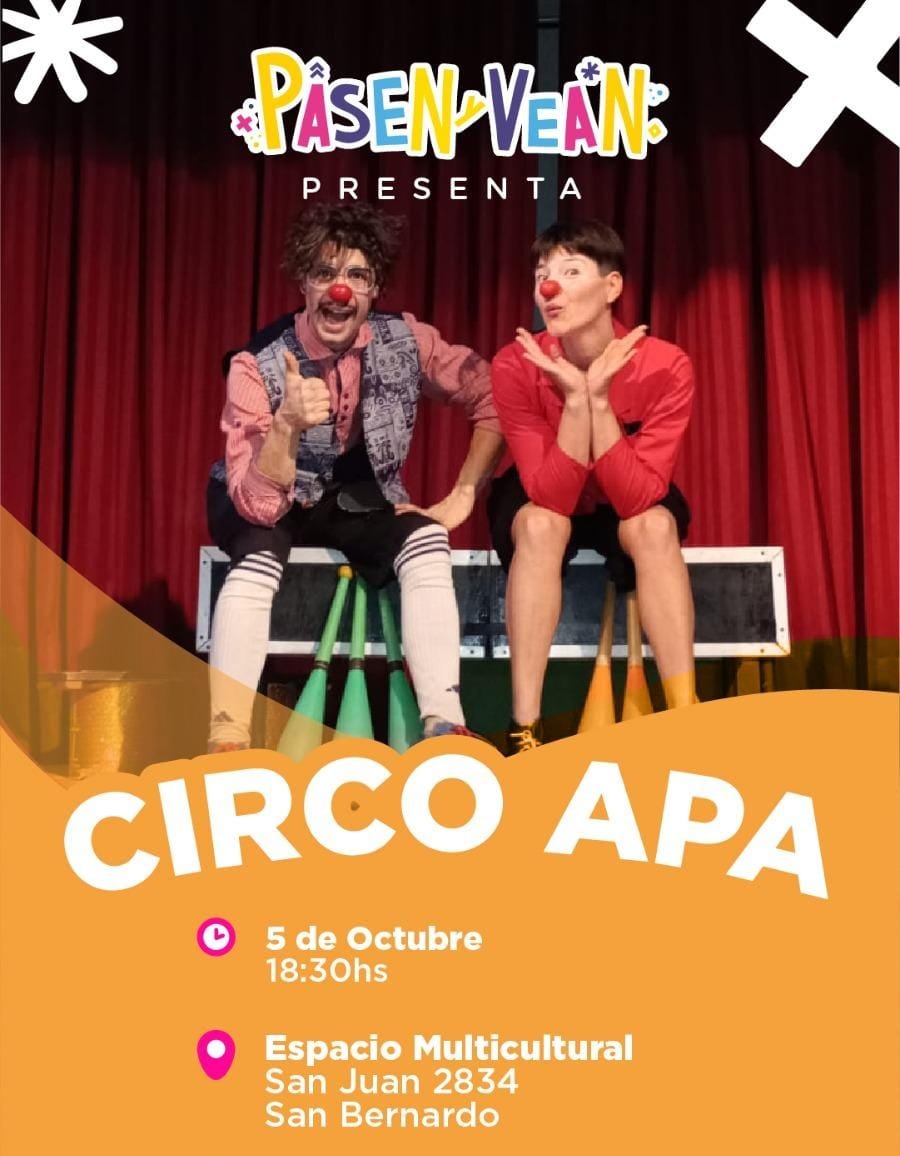Mañana sábado, desde las 18.30 hs., el programa “Pasen y Vean” se presentará en el Espacio Multicultural de San Bernardo, ubicado en San Juan 2834. La jornada promete estar llena de diversión y sorpresas, ideal para disfrutar en familia con el espectáculo del Circo Apa, que combina la magia del circo y la destreza técnica de los artistas en un ambiente de entretenimiento.