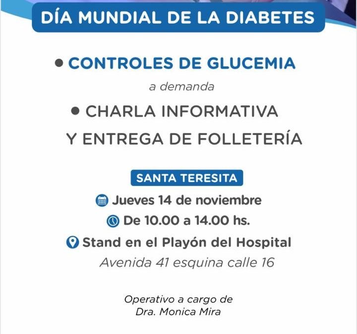 En ese sentido, la Secretaría de Salud invita a participar de una charla informativa a cargo de la Doctora Mónica Mira, que se desarrollará en un stand del Playón del Hospital de Santa Teresita, ubicado en Av. 41 esquina Calle16, el próximo jueves 14, de 10.00 a 14.00. Además, los interesados también podrán solicitar controles de glucemia a demanda.