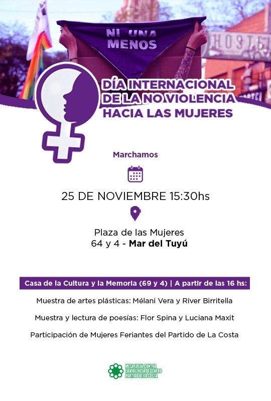 El punto de encuentro será la Plaza de las Mujeres y la Familia, en calle 64 entre 3 y 4 de Mar del Tuyú. Desde allí, a las 16 se marchará hacia la Casa de la Cultura y la Memoria, ubicada en calle 69 y 4, donde tendrá lugar el acto central.