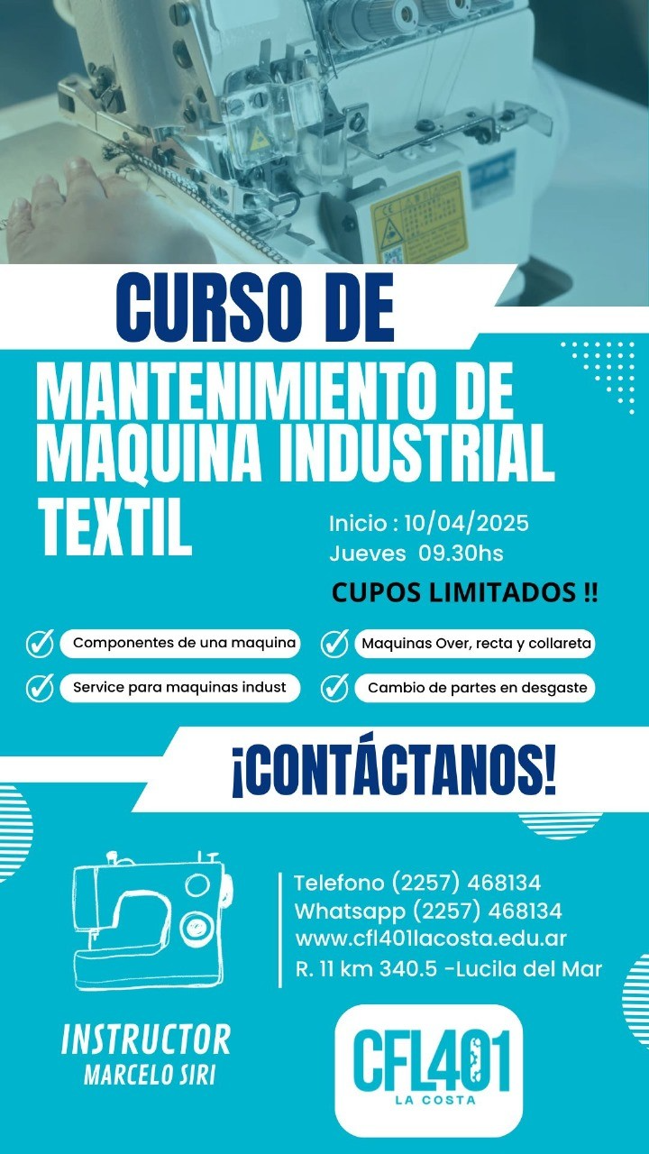 El curso de mantenimiento de máquina industrial textil, en tanto, comenzará el 10 de abril, con clases los jueves a las 9.30. Los asistentes aprenderán a realizar el servicio de máquinas overlock, recta y collareta.