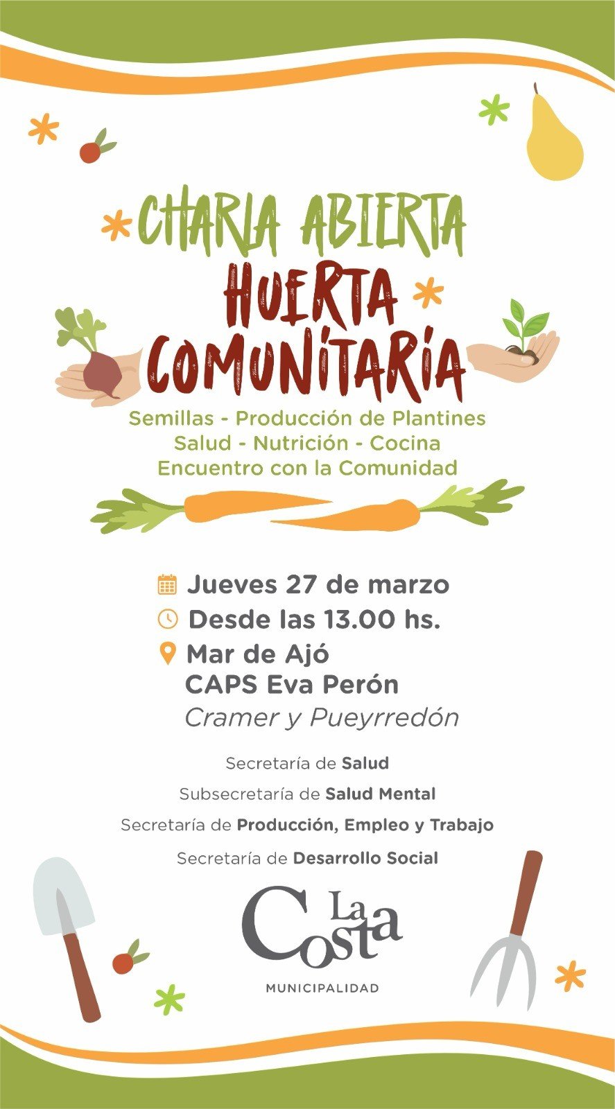 Este jueves 27, a las 13.00, se realizará una charla abierta a la comunidad sobre huertas. La cita es en el Centro de Atención Primaria de la Salud (CAPS) Eva Perón, ubicado en Crámer y Pueyrredón de Mar de Ajó.