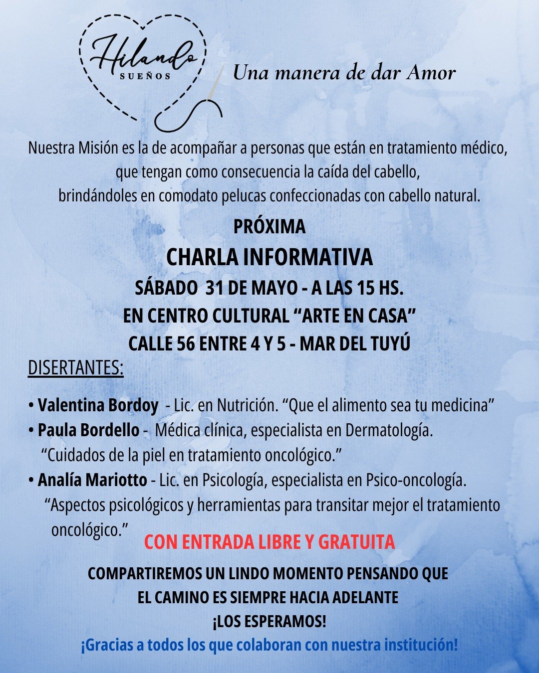 La asociación Hilando Sueños invita a la comunidad a participar de una charla informativa destinada a acompañar a personas que se encuentran en tratamiento médico y atraviesan la caída del cabello como consecuencia. La actividad se realizará el sábado 31 de mayo a las 15.00 en el Centro Cultural “Arte en Casa” (Calle 56 entre 4 y 5, Mar del Tuyú), con entrada libre y gratuita.