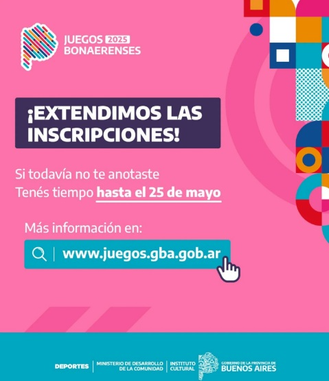 La 34ª edición de los Juegos Bonaerenses extendió el plazo de inscripción hasta el 25 de mayo. Quienes deseen participar deben completar sus datos en www.juegos.gba.gob.ar.