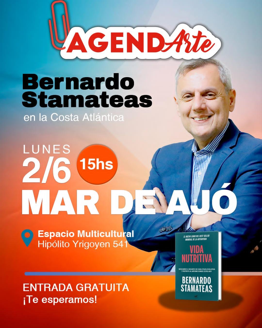 El escritor y conferencista Bernardo Stamateas ofrecerá una charla abierta en el Espacio Multicultural de Mar de Ajó, ubicado en Yrigoyen 541. La actividad, que tendrá entrada libre y gratuita, se desarrollará el lunes 2 de junio a las 15.00.