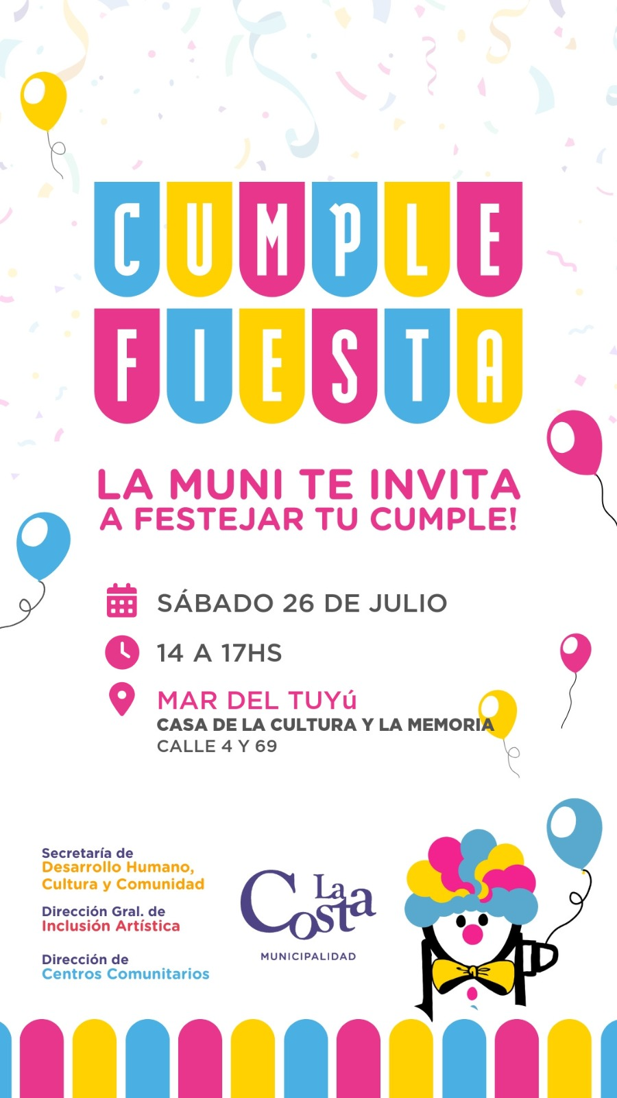 Continuando con su recorrido por todo el distrito, el programa Cumple Fiesta llegará este sábado 26 a Mar del Tuyú. El festejo de cumpleaños se realizará de 14.00 a 17.00 en la Casa de la Cultura y la Memoria, ubicada en Calle 4 y 69.