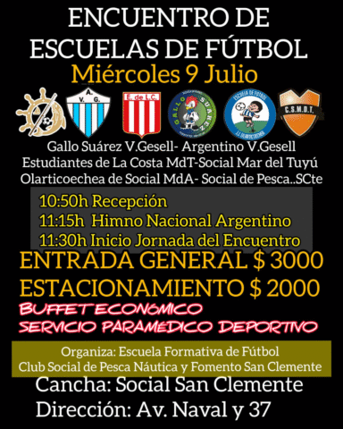 Este 9 de julio, se invita a la comunidad a participar del Encuentro Regional de Escuelas de Fútbol, que se llevará a cabo en las instalaciones del Club Social de Pesca, Náutica y Fomento San Clemente, ubicado en Avenida Naval y calle 37, San Clemente del Tuyú.