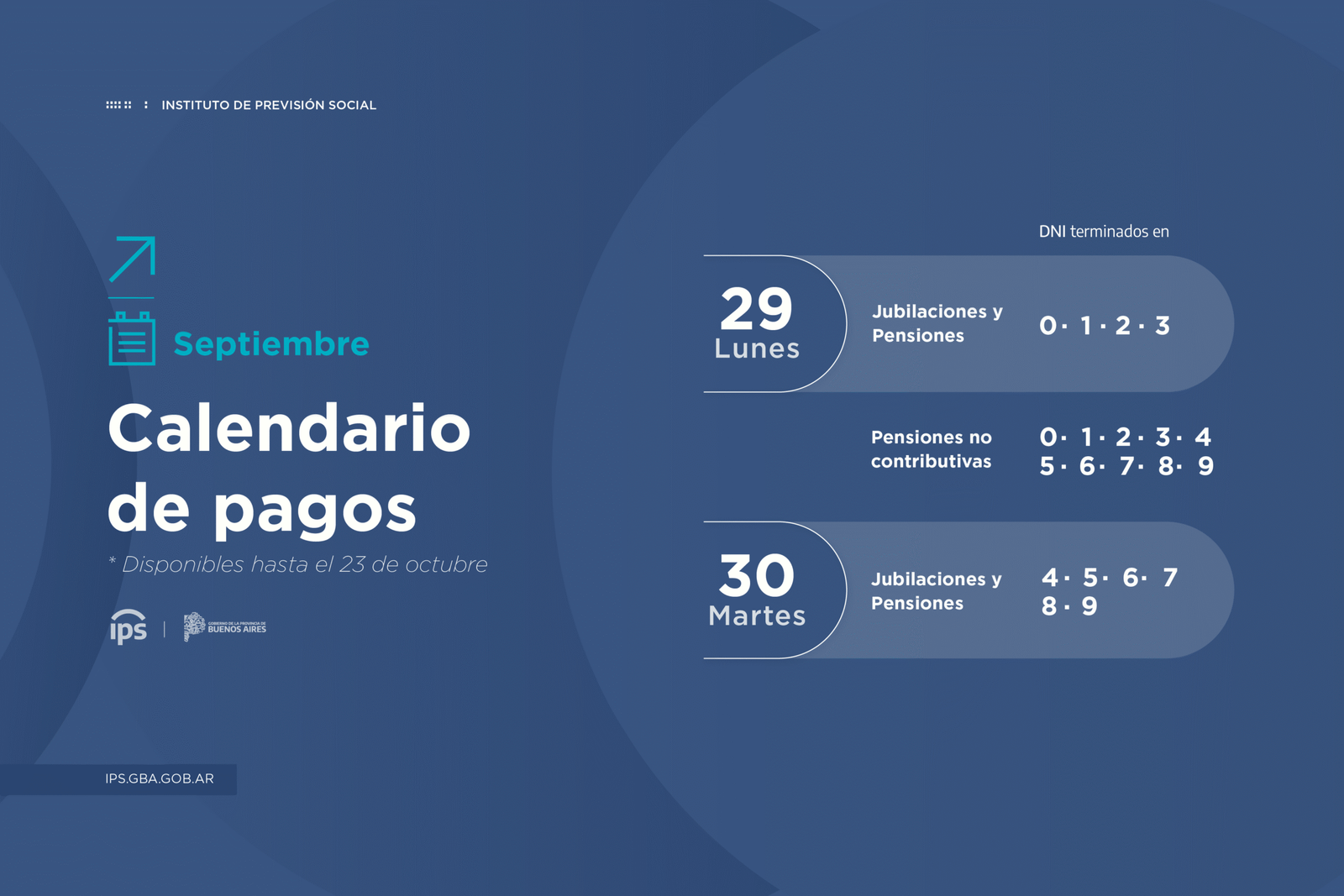 El Instituto de Previsión Social (IPS) informa que, hoy lunes 29, se inicia el calendario de pagos de los haberes de septiembre, para las personas jubiladas y pensionadas de la provincia de Buenos Aires, según cronograma que se detalla a continuación:
