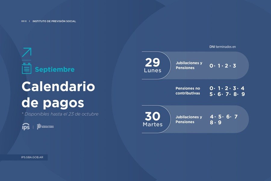 El Instituto de Previsión Social (IPS) informa que, hoy martes 30, continúa el calendario de pagos de los haberes de septiembre, para las personas jubiladas y pensionadas de la provincia de Buenos Aires, según cronograma que se detalla a continuación: