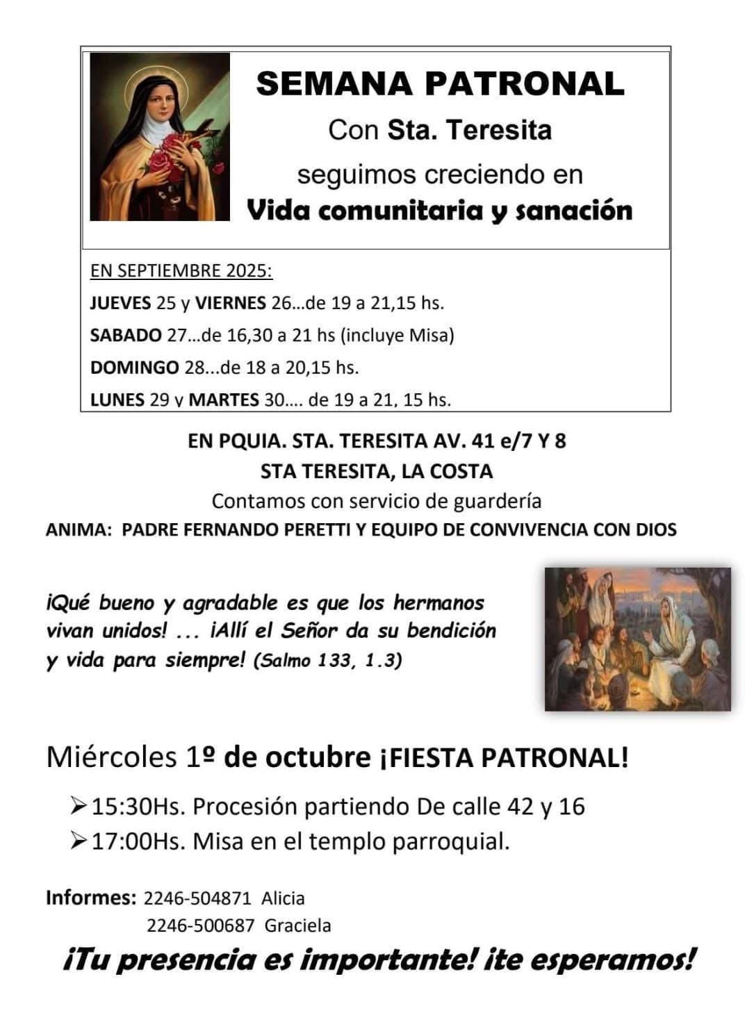 Como cada año la Parroquia de Santa Teresita ubicada en Calle 41 entre 7 y 8, invita a celebrar la fiesta patronal con una serie de actividades que comenzaron el jueves 25 de septiembre y que culminarán el 1 de octubre.
