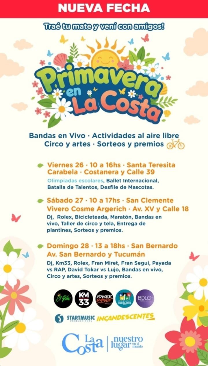 Las celebraciones de la primavera en el Partido de La Costa, que habían sido suspendidas el pasado fin de semana por razones climáticas, ya tienen nueva fecha: viernes 26, sábado 27 y domingo 28 de septiembre. Serán tres jornadas con espectáculos en vivo, deportes, actividades al aire libre y propuestas para toda la familia. Todas las actividades son libres y gratuitas.
