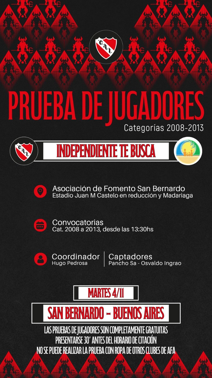 El Club Atlético Independiente llevará adelante una jornada de pruebas de jugadores en San Bernardo, abierta a jóvenes futbolistas del Partido de La Costa y la región. La actividad, gratuita y con fines de captación para las divisiones inferiores del club, representa una oportunidad única para mostrar el talento local ante uno de los equipos más importantes del país.