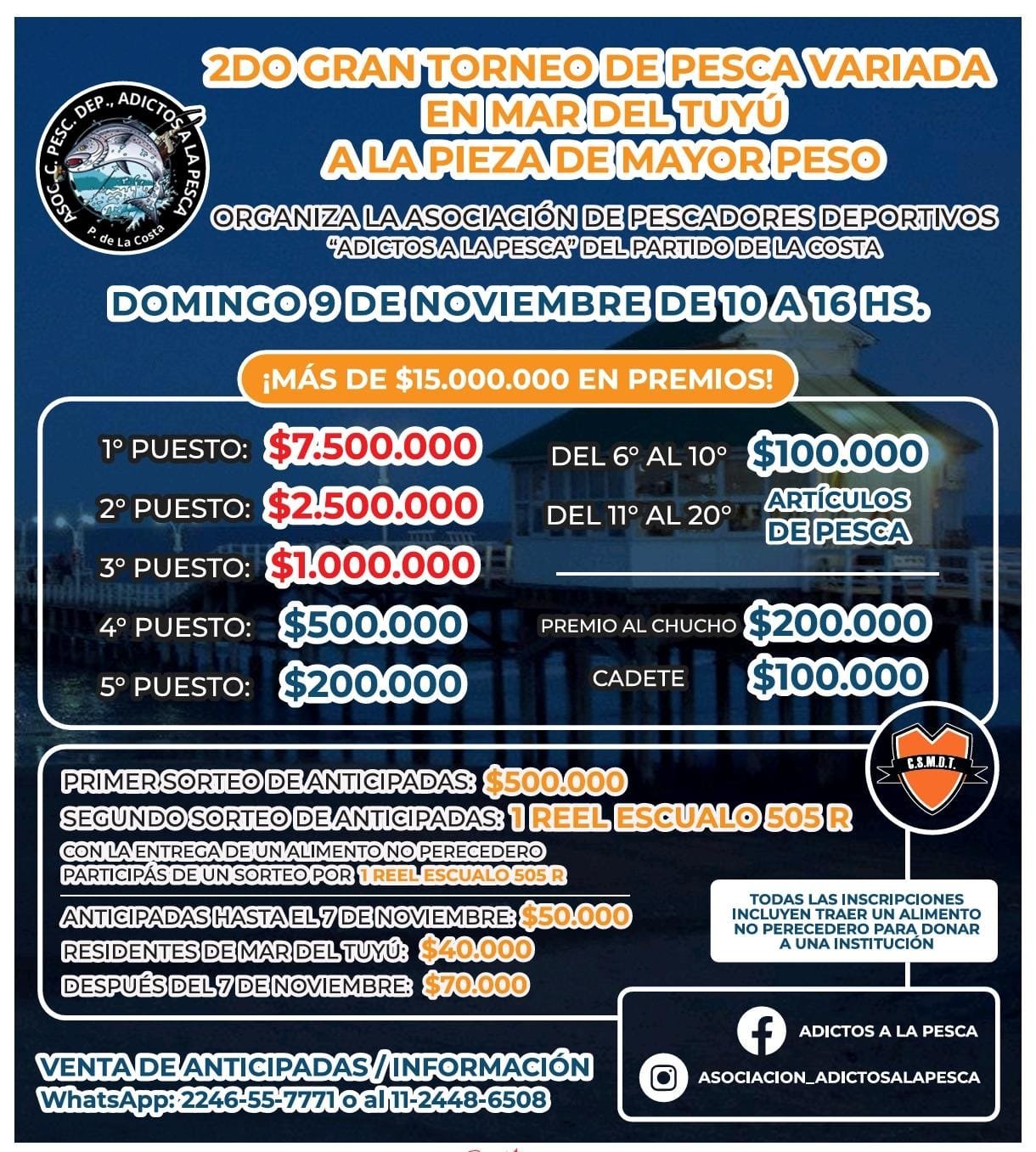 Este domingo 9 de noviembre, de 10.00 a 16.00, se realizará en Mar del Tuyú el 2.º Gran Torneo de Pesca Variada a la pieza de mayor peso, un evento que reunirá a pescadores de toda la región con más de 15 millones de pesos en premios.