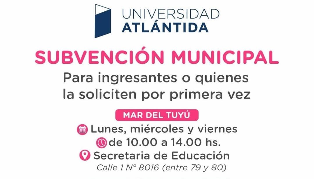 La Municipalidad de La Costa informa que a partir de hoy lunes 19 comienza la recepción de documentación para estudiantes de la Universidad Atlántida Argentina (UAA) que ingresen a la institución o que soliciten por primera vez la subvención municipal.