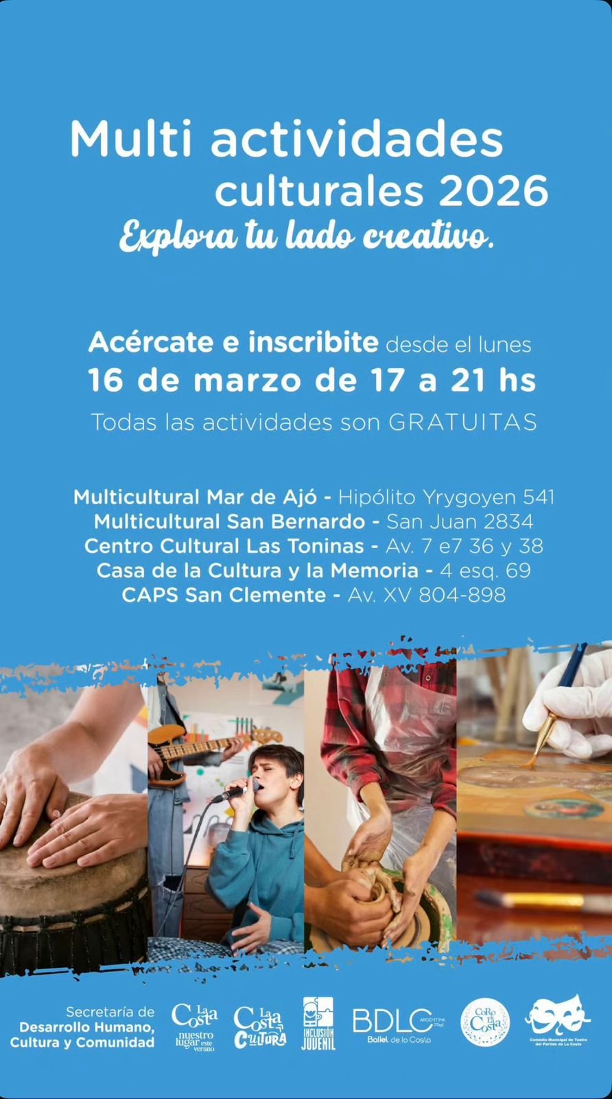 Las inscripciones son en los espacios culturales, de 17.00 a 21.00, mientras que las clases se iniciarán el próximo 6 de abril. Para anotarse, se deberá completar la planilla de inscripción y presentar una fotocopia del DNI, y también se puede consultar en https://lacosta.gob.ar/cultura/