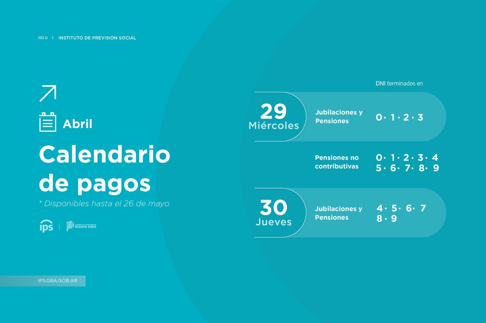 El Instituto de Previsión Social (IPS) informa que las personas jubiladas y pensionadas de la provincia de Buenos Aires percibirán los haberes del mes de abril a partir del día miércoles 29 del corriente, según cronograma que se detalla a continuación: